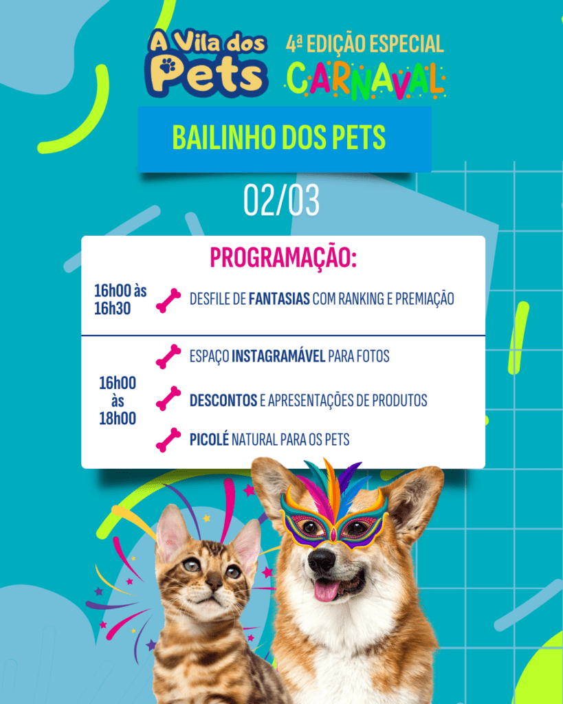 - Atividades: Feira de adoção, stands com produtos e acessórios para pets e Bailinho de Carnaval dos Pets (02/03).