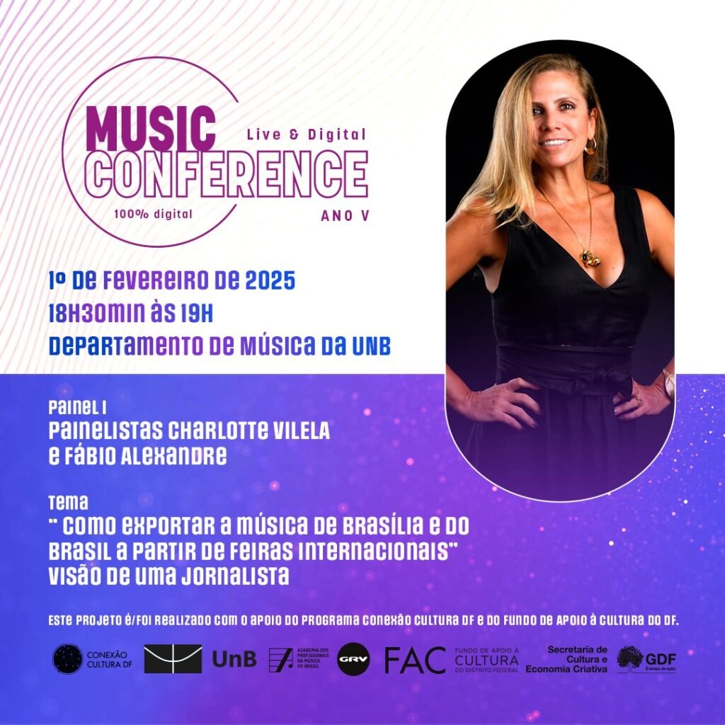 Em seguida, dois painéis abordarão a exportação da música brasileira para feiras internacionais, com a participação de Charlotte Vilela e Fábio Alexandre, que compartilharão sua experiência em eventos como o Midem e Womex. Flor Furacão também trará sua perspectiva de artista, oferecendo insights valiosos sobre como levar a música de Brasília e do Brasil para o mundo.