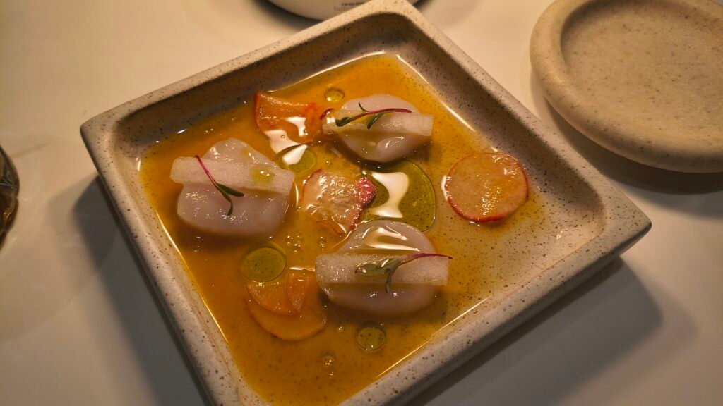 De entrada, foi oferecido um Crudo de Vieiras canadenses (R$79,00), que são as melhores, com sunomono de rabanete e pêra asiática ao molho à base de tucupi e mix de azeites de romã e cariru. Apesar do nome, o corte da vieira estava mais para o carpaccio, o que não diminui em nada a sutileza e sabor dessa entrada suntuosa.