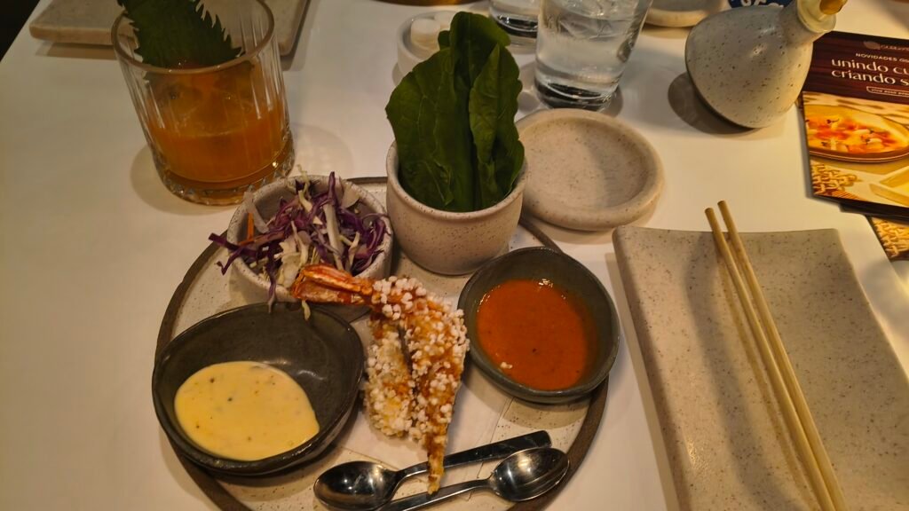 O mesmo valeu para a Hand Salad (R$75,00), que apresenta tempura de camarão em flocos de tapioca com mix de salada de repolho roxo, branco, cenoura e cebola acompanhada de alface romana e molho gochujang e maionese temperada da casa. Nossa, tudo saboroso separadamente e ainda mais gostoso quando juntamos tudo numa folha de alface para fazer a trouxinha.
