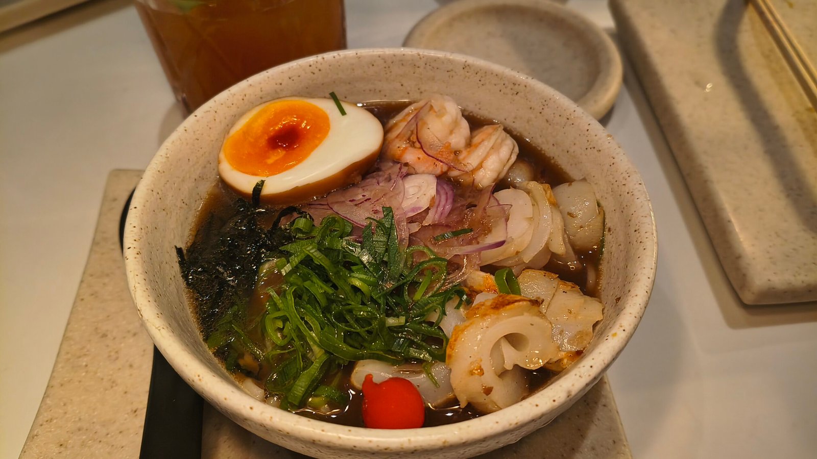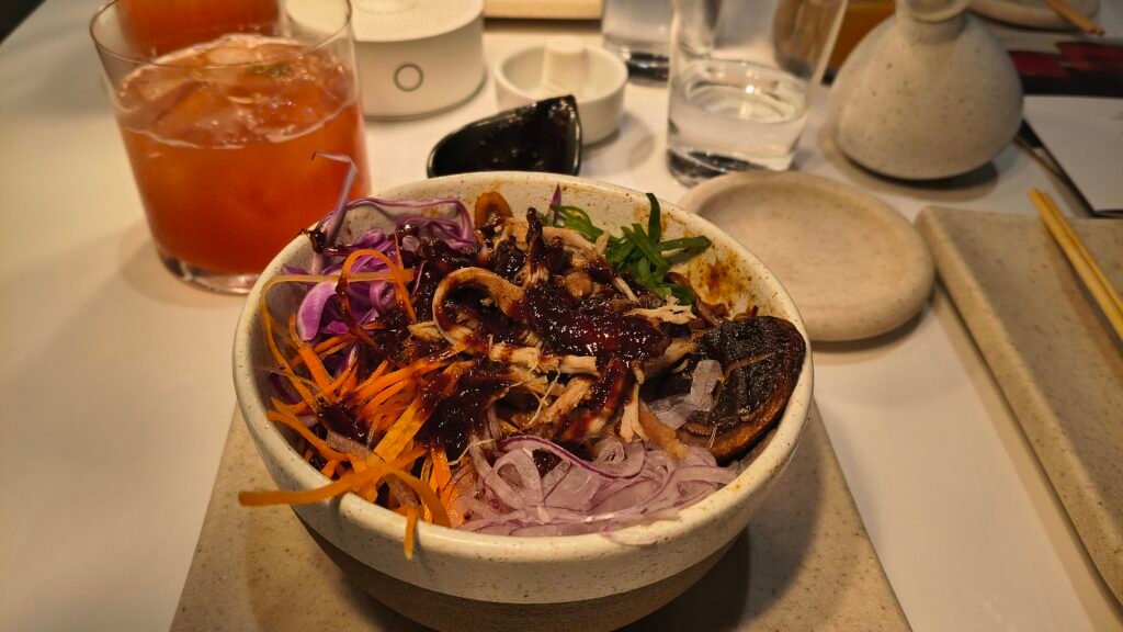 Para os principais, o Ramen Gurumê (R$75,00), feito com massa fresca em caldo de tucupi amarela e negro com shoyu, camarão e lula grelhados, ovo perfeito, alga nori, cebola roxa, cebolinha e pimenta sriracha, estava bem gostoso, mas preferi o Noodles Gurumê (R$79,00), que leva carne de porco Berkshire desfiado marinado no shoyu e gengibre com cenoura, repolho roxo, cebolinha, shitake e cebola roxa, ao molho de tucupi oriental (base de melaço de tucupi, tucupi negro e gochujang). Muito punch!
