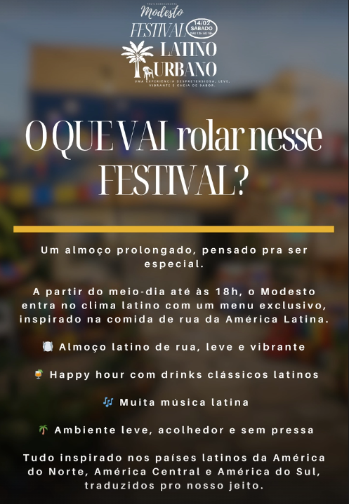 Para quem quer curtir a folga do carnaval sem necessariamente viver aquele carnaval de farra, o Festival Modesto de comida latina de rua pode ser a experiência perfeita. Um menu pensado para as mais variadas situações, como compartilhar, comer sozinho e, claro, boas opções de drinks para animar ainda mais!
