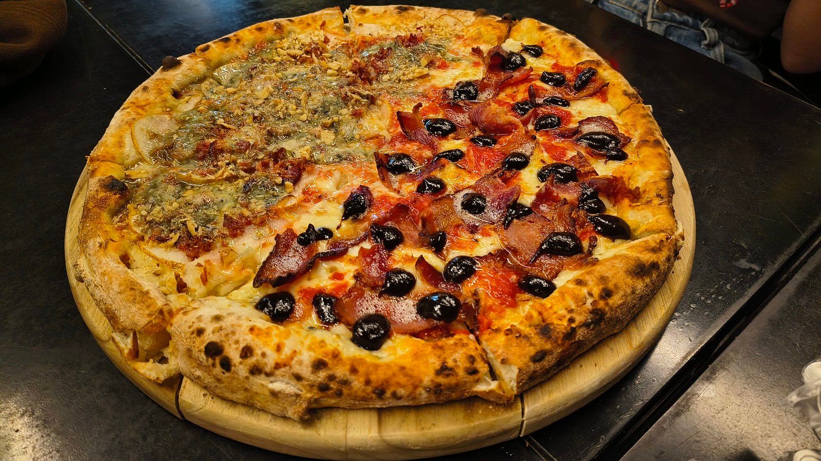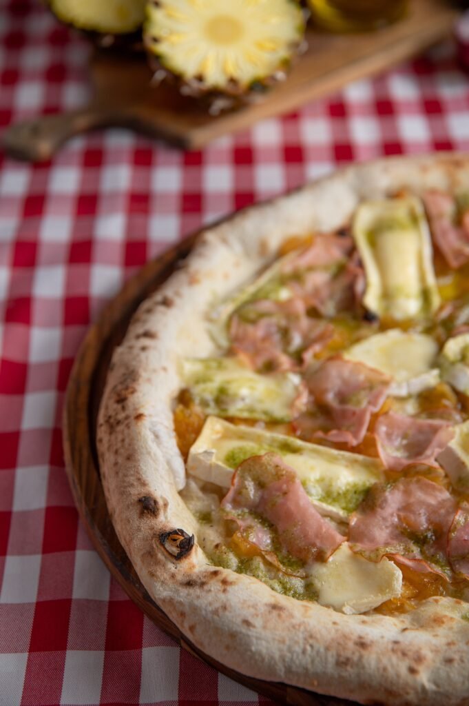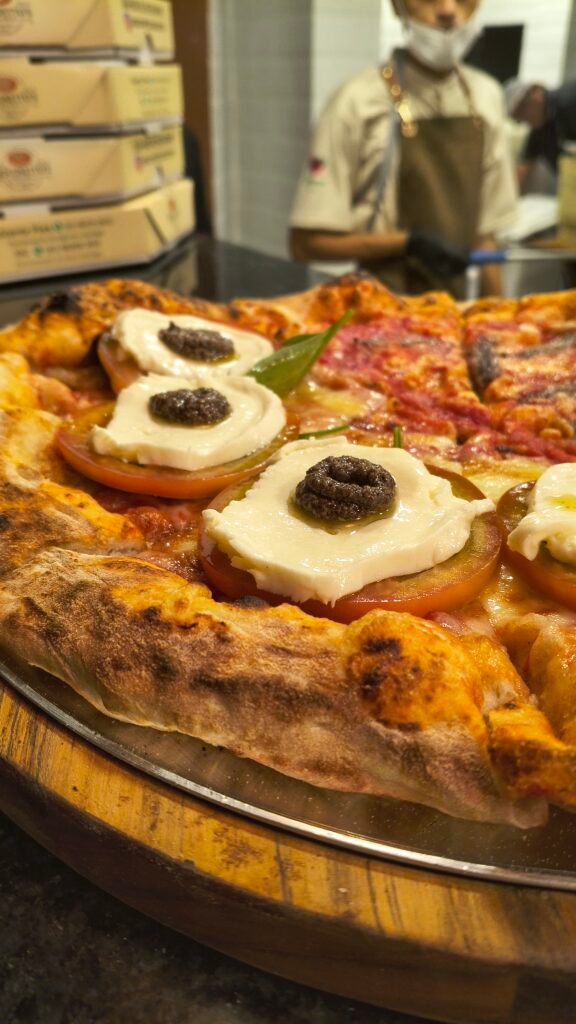 Capricciosa – disparada uma das minhas favoritas, feita com massa artesanal, molho italiano, mussarela de búfala, provolone, bacon crispy e um toque especial de geleia de alho negro, que faz toda diferença.