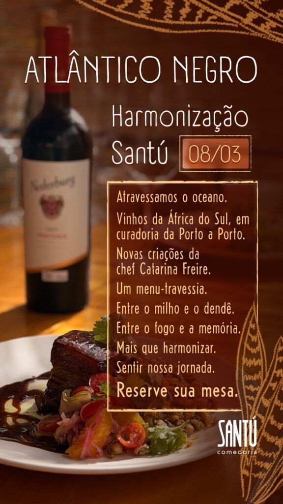 A Santú ocupa um cantinho aconchegante no final da Asa Norte e para o Dia das Mulheres, a Chef Catarina Freire optou por usar sua expertise em ingredientes locais e processos ancestrais, para criar um cardápio harmonizado com 4 rótulos da África do Sul, selecionados pela Porto a Porto. Serão 4 etapas, por R$179,00/pessoa, serviço não incluso.
