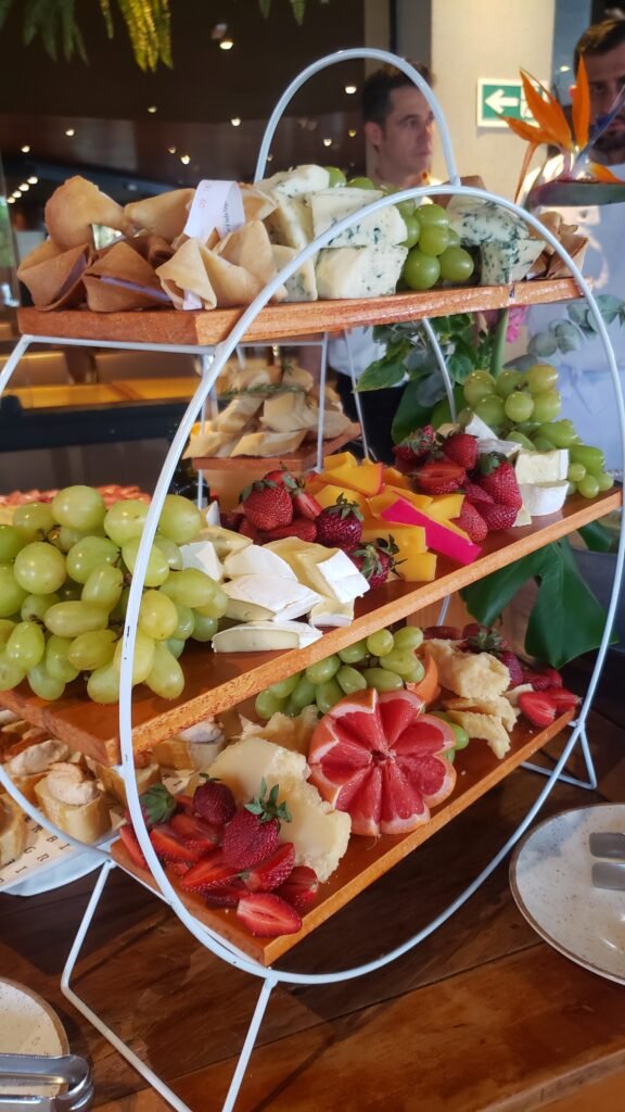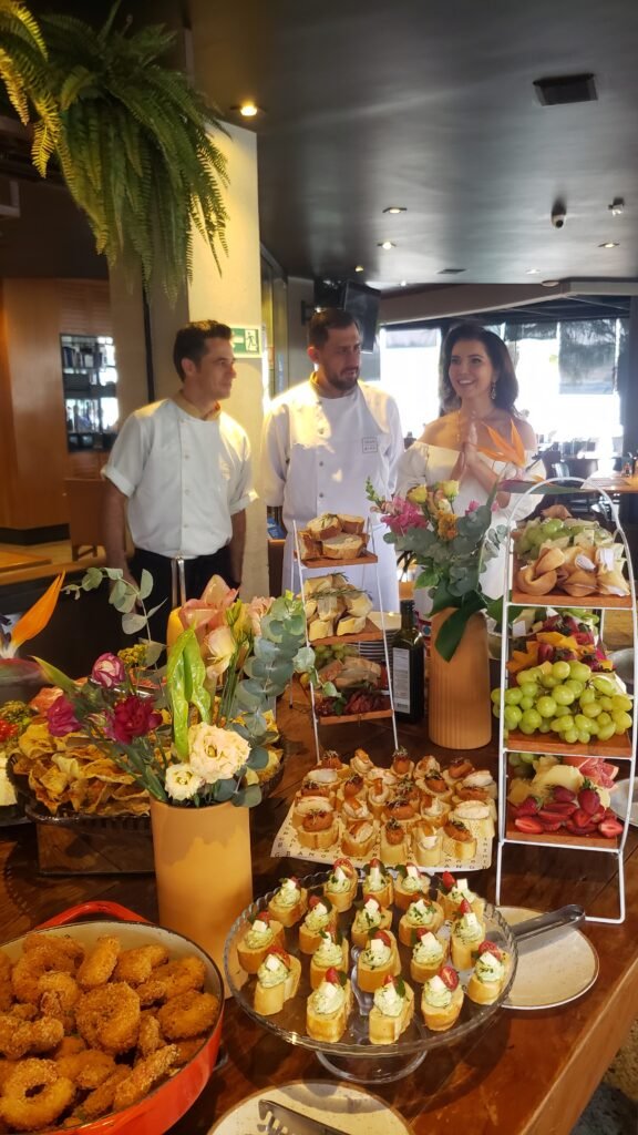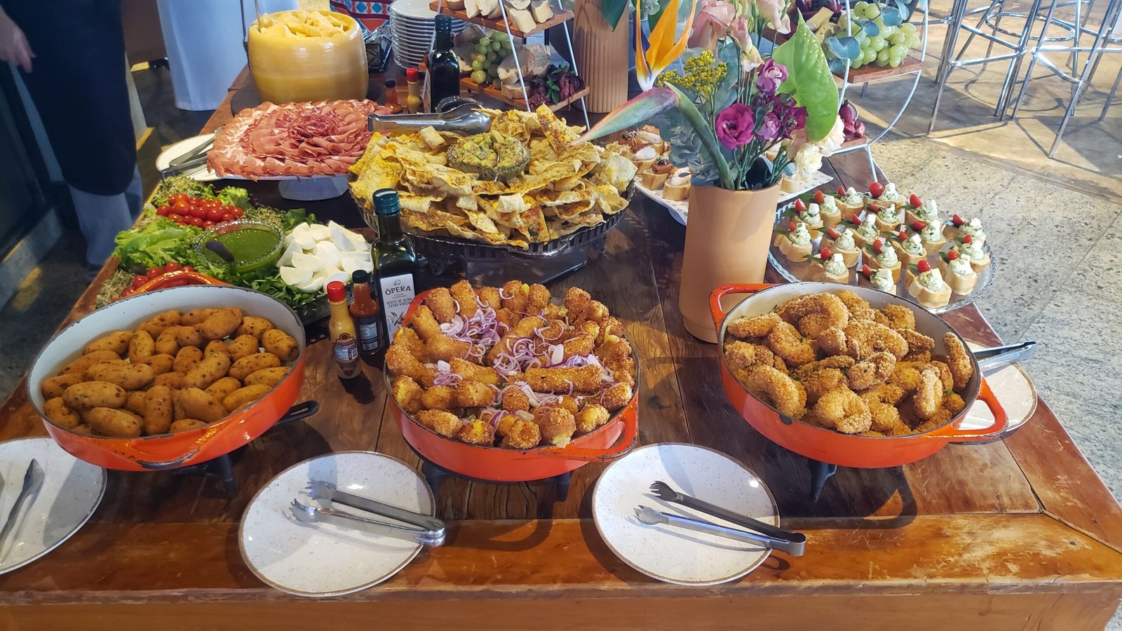 Camarão crocante, bolinhos de bacalhau, mesa de ceviches, tábua de queijos, frios e frutas, carpaccios variados, salada de lentilha, panceta, chester califórnia, mini panhoca com filé ao gorgonzola, croquete de costela, croquete de mandioca com molho de queijos.
