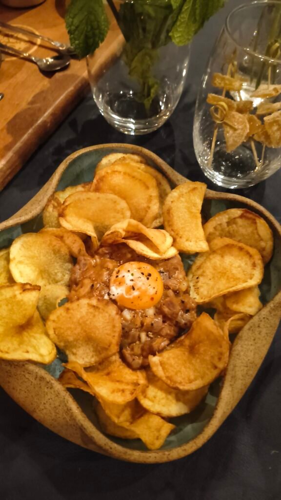 Para acompanhar, a estrela da noite, para mim, foi o steak tartare do Faro, feito com gema gelatinosa, bastante tempero e servido com chips de batata.