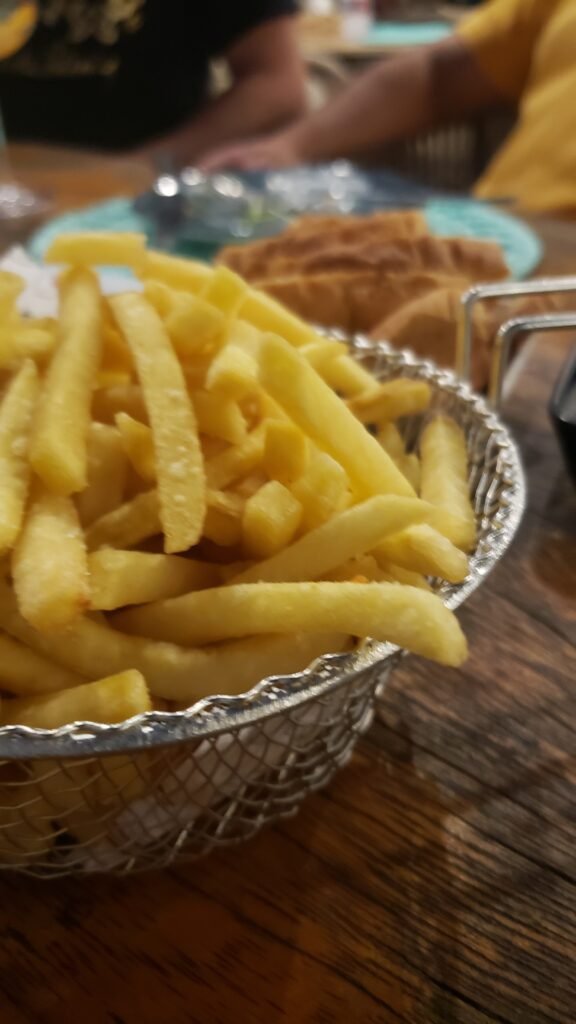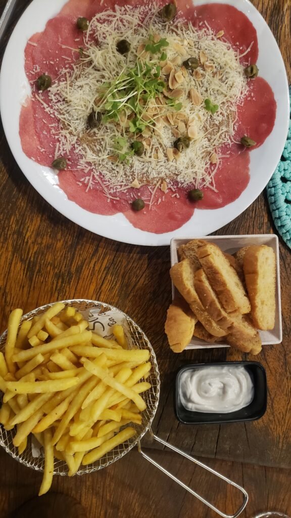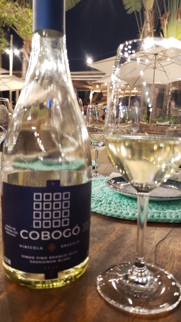 Várias opções em garrafas de 187ml, que seria uma taça mais farta, ou meia garrafa de 375ml, para aquele momento necessário de solitude, ou uma garrafa de Cobogó, Sauvignon Blanc, da Vinícola Brasília, acompanhando um belíssimo e delicioso carpaccio, feito com bastante parmesão, alcaparras e amêndoas laminadas, acompanhado de fritas perfeitas, para dividir com uma companhia agradável.