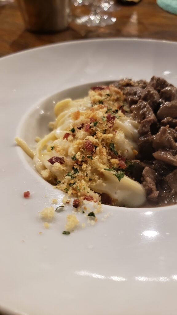 Outro casamento perfeito foi o Pinot Noir argentino da Zorzal com o saboroso prato de linguini ao molho Alfredo, feito no Formaggio gigante, bem no salão, acompanhado de filé mignon picado ao molho rotï. Perfeito!