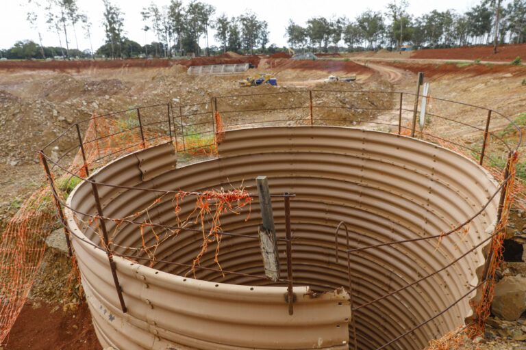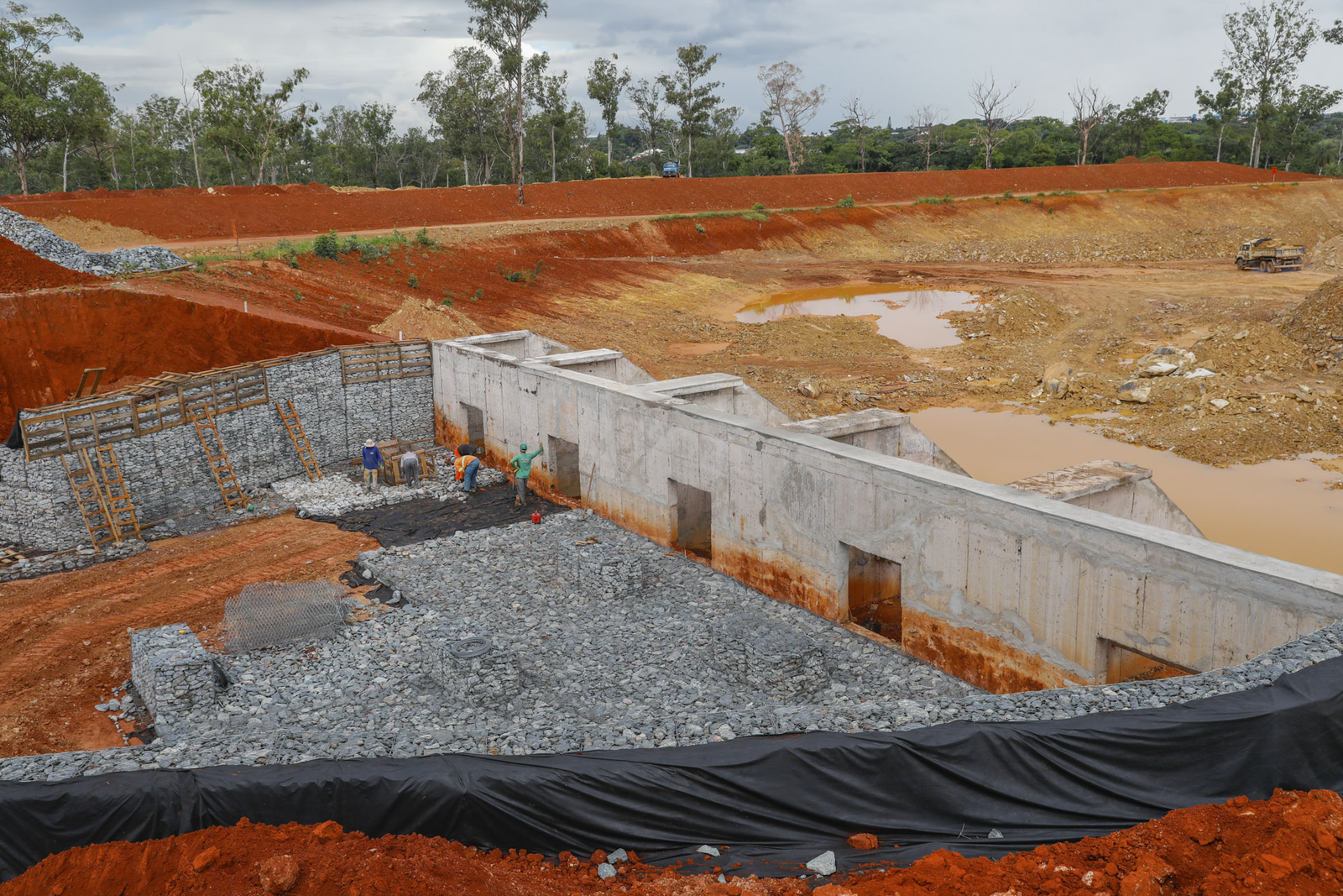 As equipes trabalham na finalização da escavação e na construção dos dispositivos de entrada e saída do volume pluvial na lagoa, bem como na execução dos poços de visita e das galerias em concreto. Os dispositivos de entrada e saída serão os responsáveis por reduzir a velocidade do volume pluvial que chegará ao Córrego Riacho Fundo. São estruturas compostas por gabiões – gaiolas de aço inoxidável preenchidas com britas de alta granulometria – e concreto.