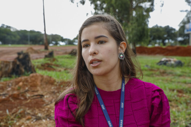 Gabriela Rodrigues, fiscal da SODF, esclarece que os dispositivos de entrada e saída da lagoa terão alturas diferentes, outra tática utilizada para reduzir a velocidade da água que chega ao corpo hídrico