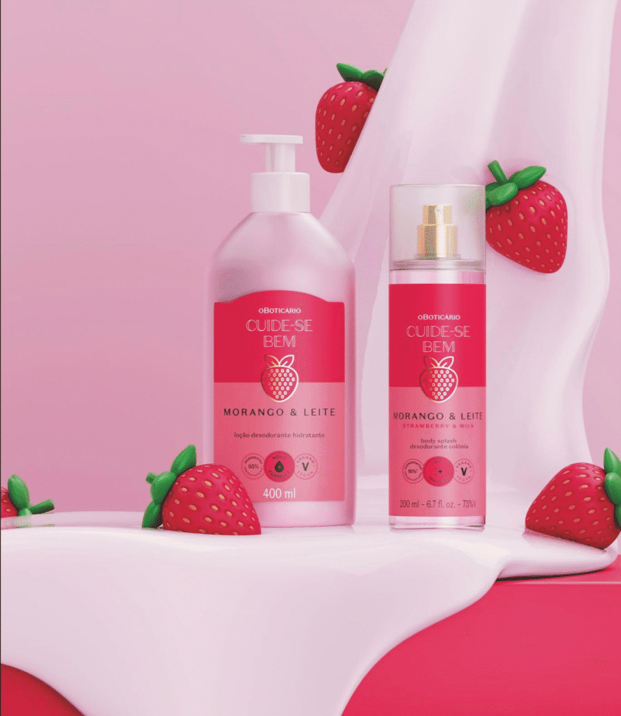 O morango é o queridinho dos brasileiros, sendo a fruta mais buscada no último ano, segundo o Pinterest, e se destacando em conteúdos nas redes sociais, estrelando sempre nos trendings topics. Este sucesso reflete também no Boticário, que recebeu mais de sete mil menções da comunidade nas redes sociais, pedindo pela volta da linha Cuide-se Bem Morango e Leite, que foi descontinuada no passado. Agora, ela retorna em nova fórmula 100% vegana para o portfólio da marca, mantendo a mesma fragrância inesquecível.