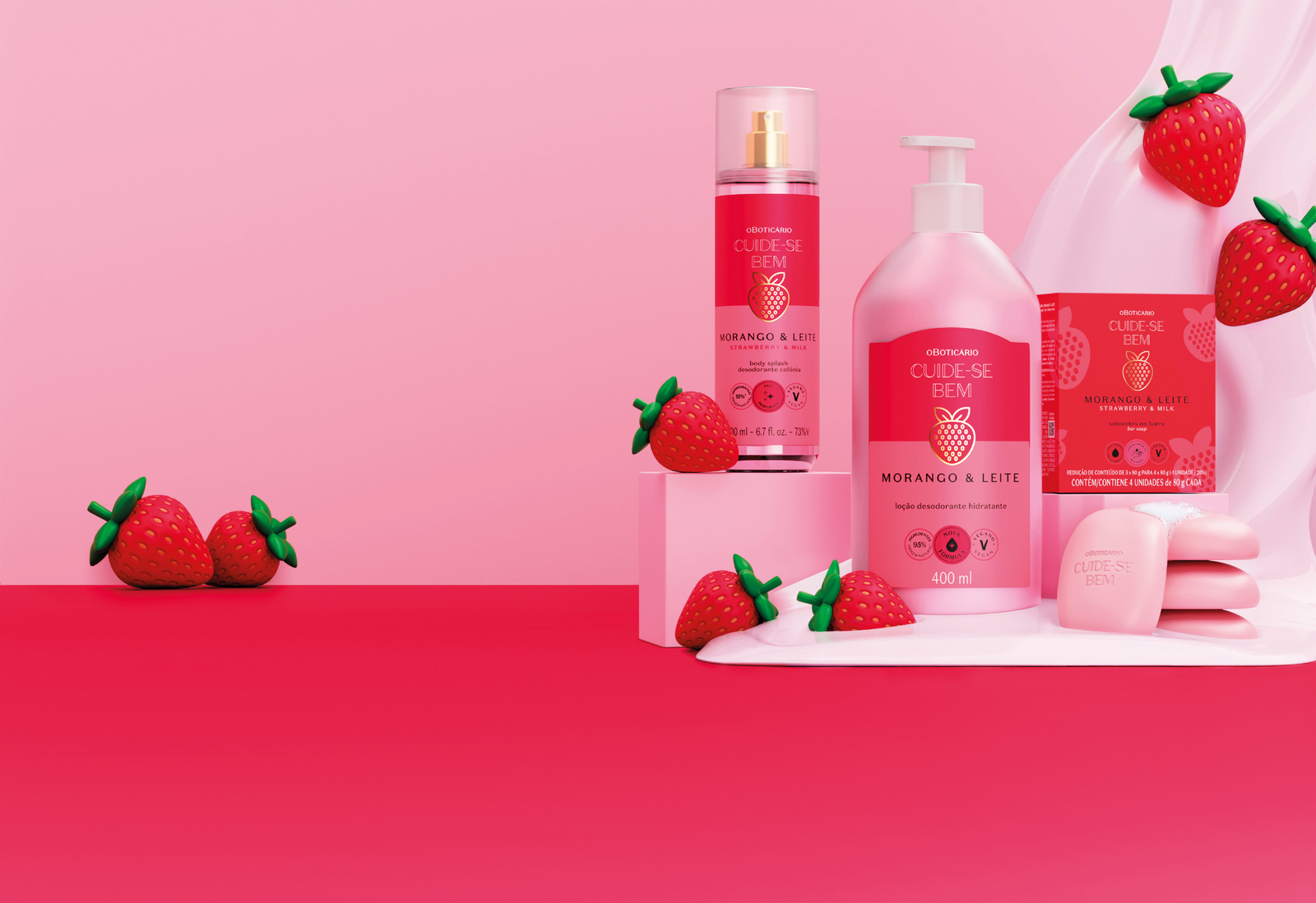 O morango é o queridinho dos brasileiros, sendo a fruta mais buscada no último ano, segundo o Pinterest, e se destacando em conteúdos nas redes sociais, estrelando sempre nos trendings topics. Este sucesso reflete também no Boticário, que recebeu mais de sete mil menções da comunidade nas redes sociais, pedindo pela volta da linha Cuide-se Bem Morango e Leite, que foi descontinuada no passado. Agora, ela retorna em nova fórmula 100% vegana para o portfólio da marca, mantendo a mesma fragrância inesquecível.