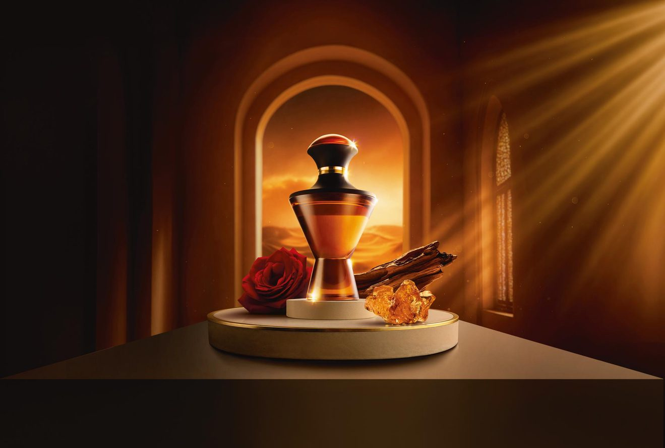 O design do frasco reforça a inspiração árabe: uma ânfora moderna, com linhas que remetem a peças ancestrais e simbolizam estabilidade e propósito. A embalagem, com detalhes dourados e arabescos sutis, posiciona o perfume dentro do território do luxo contemporâneo.