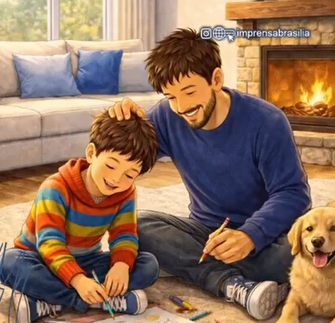 - A parte mais marcante surge quando aparece: “chat, crie uma imagem de uma criança que recebe muito mais do que só pensão”. Nesse momento, a cena mostra uma criança recebendo carinho do pai e brincando com ele no chão da sala.