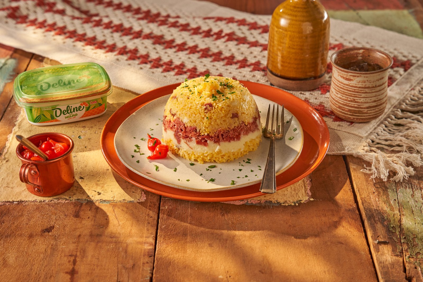 - Coloque camada de carne seca e por cima dela, uma camada de queijo tipo catupiry. Por último, coloque mais uma camada da massa do cuscuz e leve para cozinhar por cerca de 5 a 10 minutos na cuscuzeira.