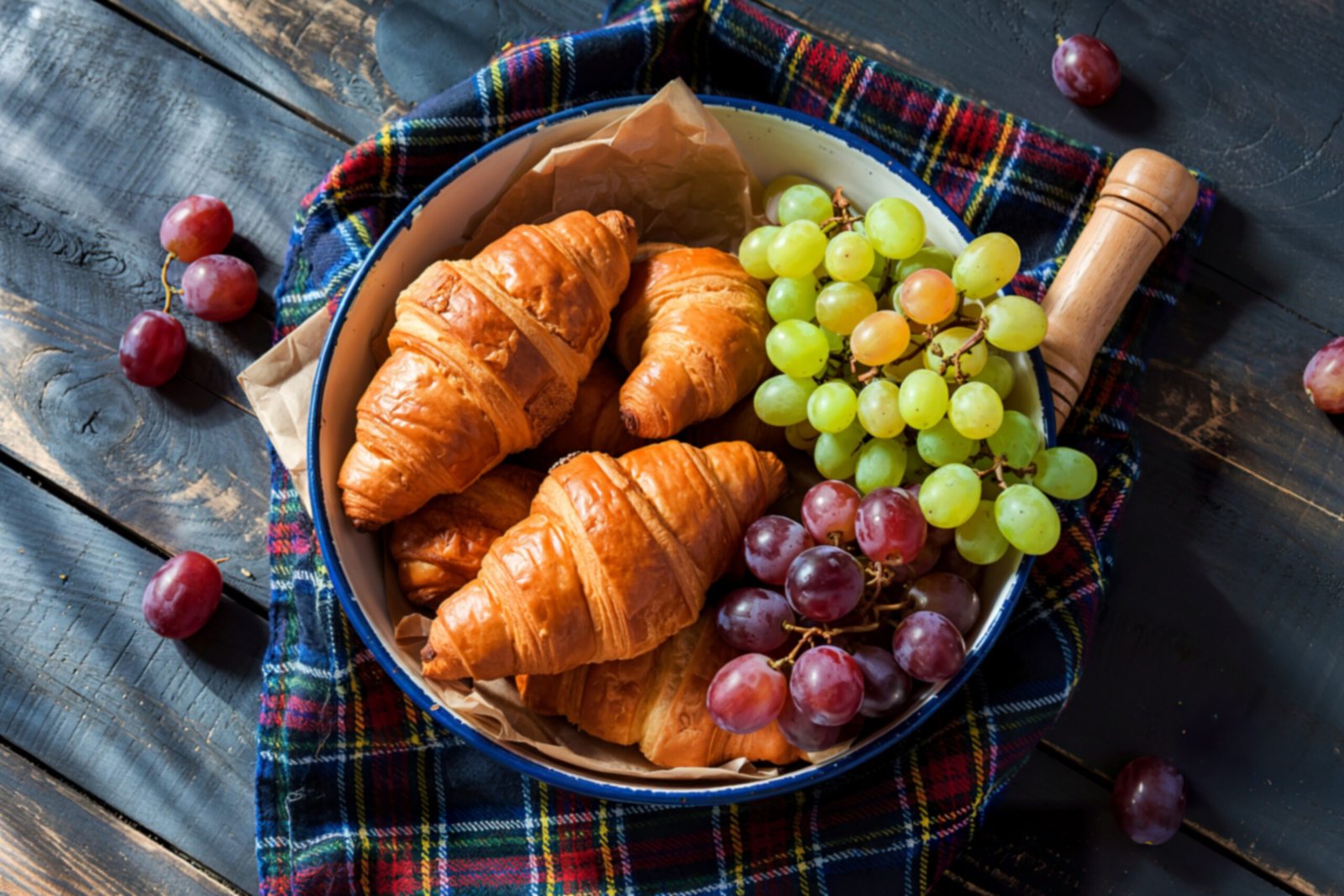 top view of croissants and grape in bowl on plaid cloth on wooden background