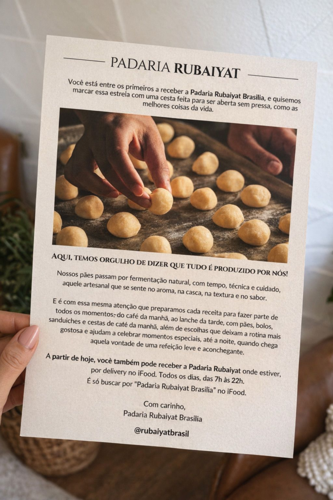 Para quem busca praticidade, os pedidos podem ser feitos pelo iFood: basta procurar por “Padaria Rubaiyat Brasília”, selecionar os favoritos e receber onde estiver. O atendimento acontece de segunda a sábado, das 7h às 22h, e aos domingos, das 7h às 17h, garantindo que o cuidado presente em cada fornada chegue até o cliente todos os dias.