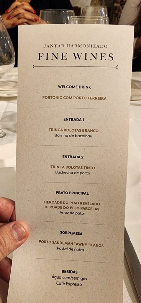 O evento foi conduzido pelo especialista em vinhos e Diretor de Vendas Internacionais da Sogrape (gigante empresa portuguesa no ramo de vinhos e dona de mais de 30 marcas, como Herdade do Peso, Porto Ferreira, Mateus, Casa Ferreirinha, entre outras), Sr. Filipe Neves, que conduziu com maestria o jantar, explicando a origem da vinícola, o terroir daquela região e os vinhos que são produzidos por eles. Tivemos a oportunidade de provar 4 rótulos da Herdade do Peso (Trinca Bolotas Branco 2022, Trinca Bolotas Tinto 2021, Revelado Alentejo D.O.C. 2020 e o incrível Parcelas Alentejo D.O.C. 2018) e 1 rótulo da Sandeman, todos perfeitamente harmonizados com pratos maravilhosos da culinária portuguesa elaborados pelo Chef do Restaurante Manuelzinho.