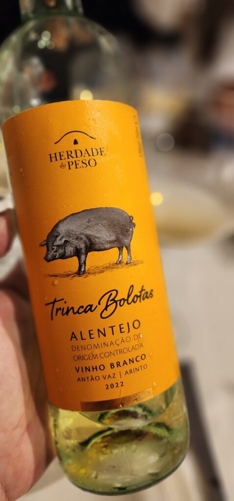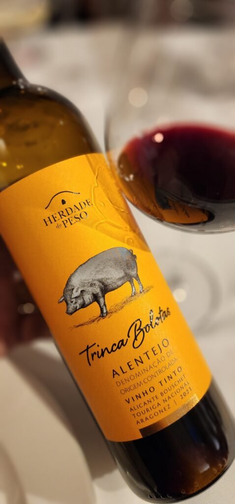 Os vinhos da linha Trinca Bolota fazem referência ao porco alentejano, passeando livremente, onde se alimenta preferencialmente de bolotas, sendo o único sobrevivente dos suínos de pastoreio na Europa e é patrimônio do Alentejo. O vinho branco desta linha é um blend de Antão Vaz e Arinto, trazendo notas florais e frutadas, com bom volume de boca e deliciosa acidez, acompanhando muito bem o bolinho de bacalhau servido como entrada. O tinto, por sua vez, é um blend de Alicante Bouschet, Touriga Nacional e Aragonez, trazendo muita jovialidade no nariz e no paladar, acidez gastronômica e deliciosa concentração de fruta. Combinou deliciosamente com o aperitivo inusitado e riquíssimo em sabor da bochecha de porco.