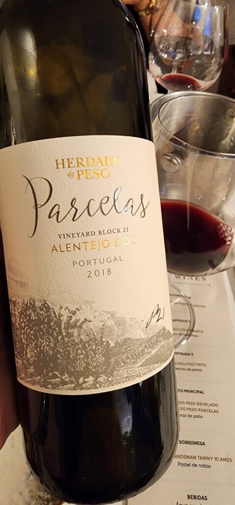 Para acompanhar o prato principal, Arroz de Pato (que estava fenomenal, diga-se de passagem), provamos dois vinhos: o “Revelado Alentejo D.O.C. 2020”, um blend de Alicante Bouschet (50%), Syrah (35%), Cabernet Sauvignon (15%), com estágio em 12 meses em barricas de carvalho francês, que mostrou-se encorpado, com taninos muito bem lapidados e final delicioso; e provamos também o “Parcelas Alentejo D.O.C. 2018”, um delicioso varietal de Alicante Bouschet, com uvas provenientes de uma única Parcela, a Parcela 21, colhidas manualmente, com seleção criteriosa bago a bago, onde foram adicionados 30% de engaço ao mosto para dar mais complexidade e estrutura ao vinho, que depois estagiou em tonéis de 3000 litros de carvalho francês durante 12 meses. Um primor de vinho, com muita complexidade, bastante equilíbrio e excelente potencial de envelhecimento.