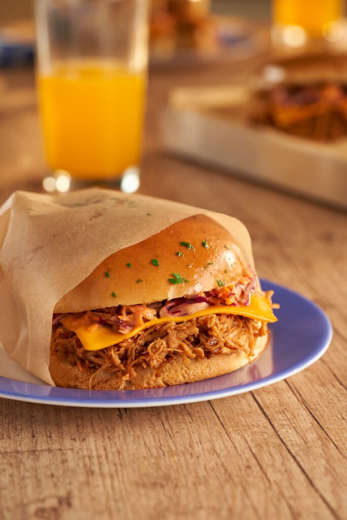- Distribua o recheio de frango sobre os pães e coloque uma fatia de queijo cheddar em cada lanche. Cubra com a salada de repolho e cenoura.