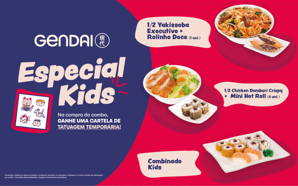 Na rede Gendai, até o fim do mês, na compra de um combo meia porção, o cliente leva de brinde uma cartela de tatuagens temporárias de temática oriental para divertir as crianças. A promoção é válida no balcão dos restaurantes da rede.