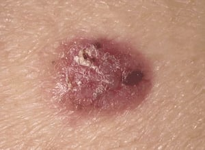 - Pequenos nódulos rosados, avermelhados ou da cor da pele, que crescem lentamente.