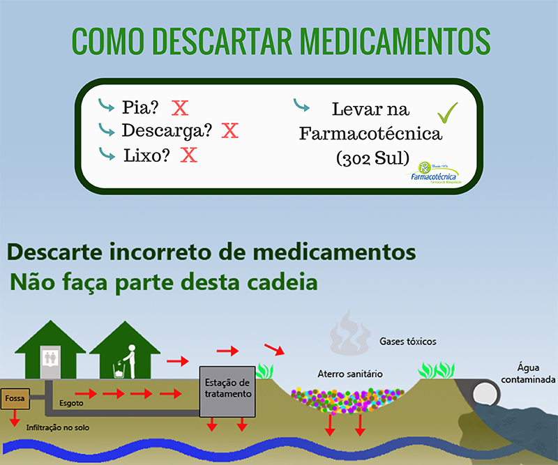- Medicamentos vencidos ou em desuso também não devem ir para o lixo comum ou esgoto. Procure farmácias que participem de programas de recolhimento.