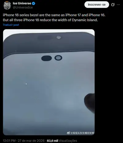 O iPhone 18 teria uma Dynamic Island significativamente menor, segundo o informante. (Fonte: UniverseIce/X)