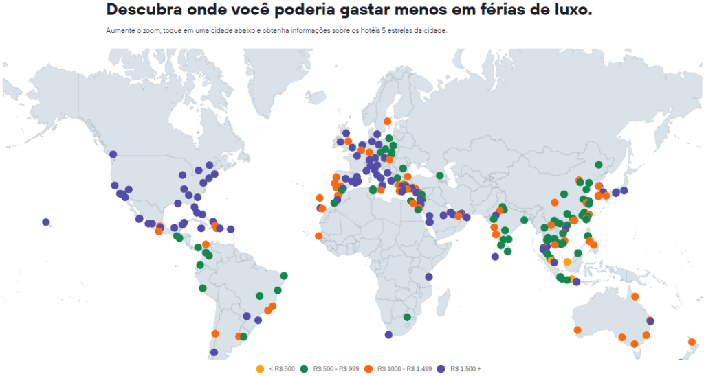 Férias de luxo e economia são palavras que podem voar juntas, sim! Por meio de um mapa-múndi interativo, com a ferramenta Juntando Estrelas, do KAYAK, é possível que o viajante encontre preços médios de hotéis 5 estrelas em vários destinos. Para isso, basta aumentar o zoom ou clicar em um local específico para localizar mais informações sobre as estadias de cada cidade. É possível ainda filtrá-los pelo preço por noite.